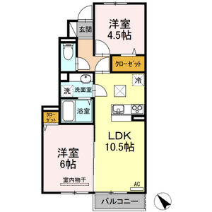 倉敷市西中新田のインターネット無料(D.U-NET/Wi-Fi付)2LDK・オール電化のお部屋です。オートロック・宅配BOX有!1坪の浴室、カウンター付の洗髪洗面化粧台、室内物干等の設備がついています♪